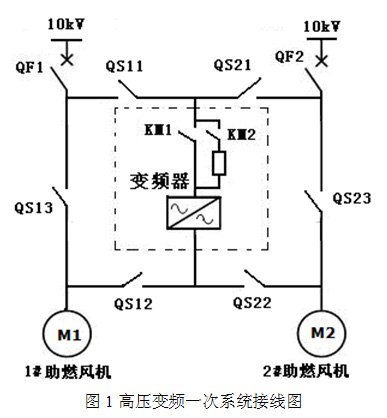 1#高爐熱風爐助燃風機2臺,采用一用一備。變頻改造采用2臺助燃風機共用一套高壓變頻器,2#高爐熱風爐2臺助燃風機共用一套高壓變頻器。以1#高爐2臺助燃風機為例說明控制過程。其一次系統(tǒng)接線圖路如圖1所示,通過切換高壓隔離開關(guān)把高壓變頻器切換到要運行的風機上去。如圖所示高壓變頻器可以拖動1#風機電動機實現(xiàn)變頻運行,也可以通過切換拖動2#風機電動機實現(xiàn)變頻運行。1#、2#風機電動機均具備工頻旁路功能。