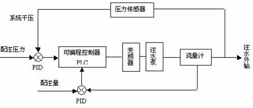 本系統中,一方面在泵出口管線上安裝一只高可靠性壓力傳感器,將實測的壓力信號與系統的配注壓力(期望值)相比,并將其差值送往過程參數調節器( PID )進行比例和積分運算,最后將輸出結果送給可編程控制器( PLC );另一方面在泵入口管線上安裝一只流量計,用于監測系統實際總流量,將該值與系統配注量的差值再進行一次 PID 整定,最后將輸出結果送給 PLC 。 PLC 根據所接收的兩個 PID 整定信號,利用模糊推理的方法,在滿足系統干壓的前提下,系統及時自動調整高壓變頻器的輸出頻率從而控制變頻泵的轉速。由離心泵原理知,泵轉速的變化可引起相應的排量變化,通過頻率的變化以達到期望的排量值。通過上述閉環控制,使系統的實際壓力和排量與系統的配注壓力和配注量相接近。系統設計為閉環控制系統,流量和壓力為系統的兩個主要參數,將系統實測的流量和壓力信號與地質要求的流量和壓力(期望值)進行雙 PID 調節;通過模糊推理的方法自動尋優控制,根據推理結果,系統及時自動調整高壓變頻器的輸出,并自動計算出變頻器的較佳運行頻率。
