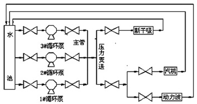 浙江省衢州巨化硫酸廠是我國首批自己設計、制造、安裝的重點硫酸生產企業,是浙江省較大的硫酸生產廠。在硫酸生產過程中,需要對水冷極板進行冷卻,冷卻水循環泵是硫酸生產工藝中的重要設備,過去冷卻水循環泵均不調速,利用出口閥門來控制水流量和管網壓力,由于設備的選擇都是按最大負荷情況來選型,在實際運行中設備留有較大的裕量,冷卻水的流量與壓力是通過冷卻水循環泵出、入口聯絡管上的調節閥來進行調節,造成電動機運行效率較低,造成電能浪費,為降低企業生產成本,廠家領導經過反復論證,多方比較,決定選用我公司JD-BP37-280F型高壓變頻器對冷卻水循環泵進行變頻調速節能改造,以解決能源浪費問題。用戶冷卻水循環泵的電動機參數為6KV/280KW異步電動機,額定轉速985r/min,水泵參數為500S-35 單級雙吸離心泵。冷卻水循環泵工作原理如圖2所示,三臺循環泵兩開一備。