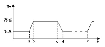高爐生產為周期性間斷出鐵,高爐在出鐵時,產生大量棕紅色煙塵,此時要求風機高速運行;在不出鐵時,產生煙塵相對較少,只需要很低的轉速。利用變頻器根據高爐實際需要對除塵風機進行變頻調速控制,既保證和改善了工藝,又達到了節能降耗的目的。出鐵時,變頻器高速運行,高速定為45HZ(可調);不出鐵時,變頻器低速運行,低速定為20Hz(可調)。用戶的風機型號為 Y4-73,電機型號為 Y 560-3-8 。高爐除塵風機工藝要求曲線如圖4。